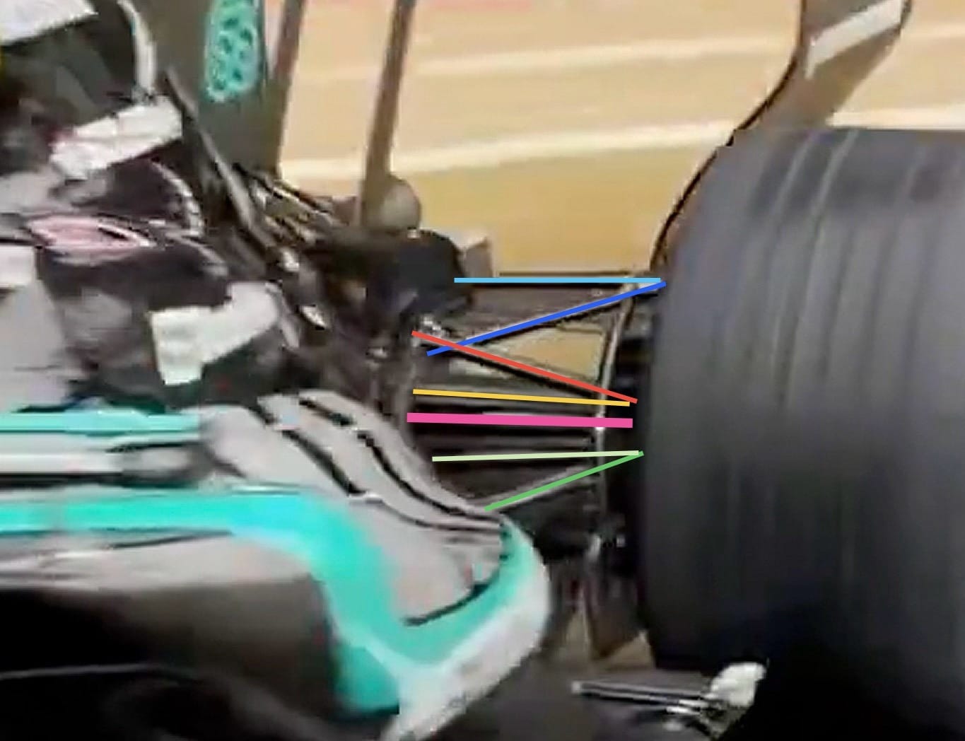 In the renders you couldn't see much of the suspension wishbone geometry. But from this on-track shot we can see Mercedes has retained the anti-dive on the top wishbone (forward leg dark blue highlight, rearward leg light blue highlights) the pushrod (red highlight) and what I think is the front track rod (green highlight).