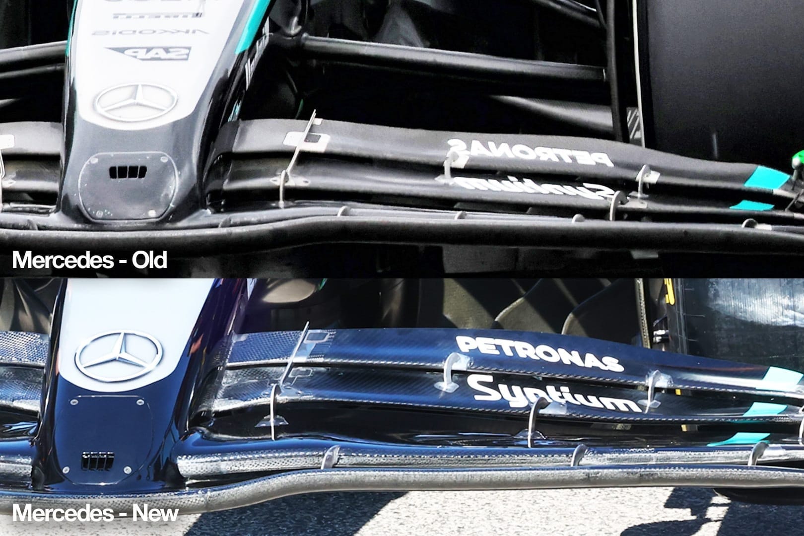 Mercedes also has a largely new front wing with changes to its chord length and span by reprofiling the individual elements. This produces "a change in upwash field behind the wing, resulting in improved onset flow to the rear".