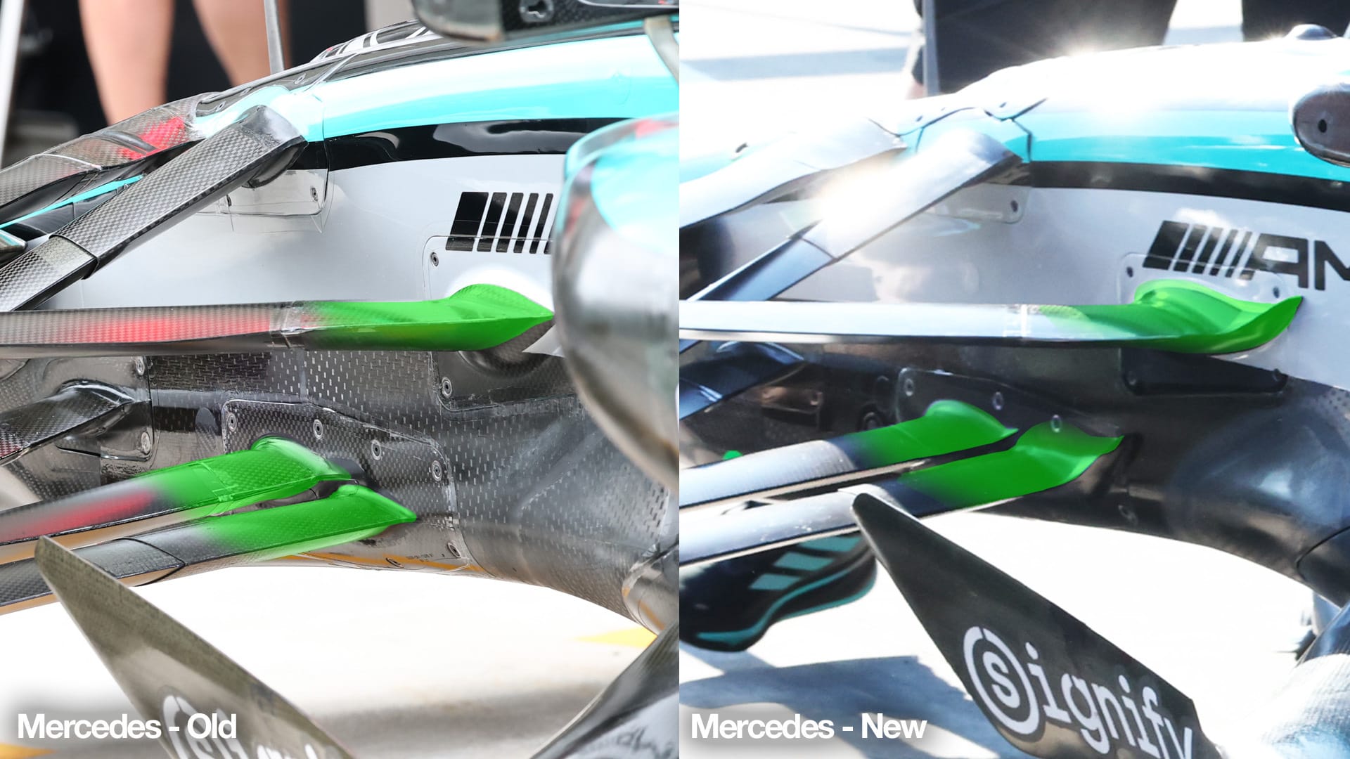 Mercedes says this reprofiling is to improve aerodynamic robustness in a variety of conditions, improving flow to the rear of the car and consequently floor load.