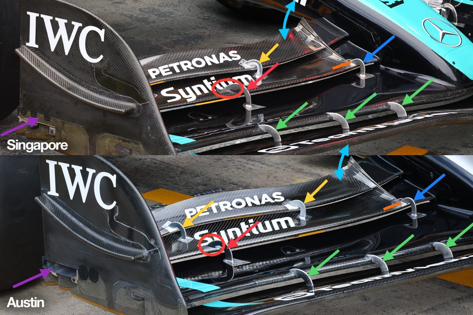 As I always say, the overall airflow that the car has to work with comes from the wake from the front wing. This revised version of Mercedes’ front wing at Austin is all about allowing more rotational flex from the two rear flaps.