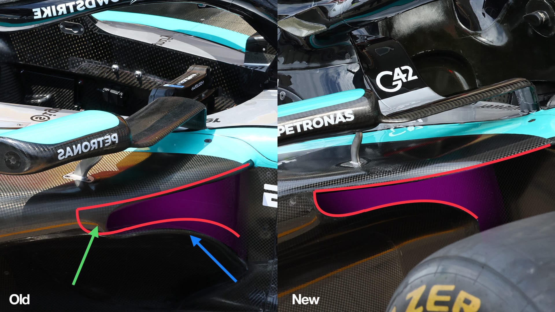 The green arrow highlights the fact that Mercedes has widened the opening, even if the angle of the pictures is slightly different. The blue arrow shows that as well as moving it rearward, it has raised the roof of the sidepod undercut.