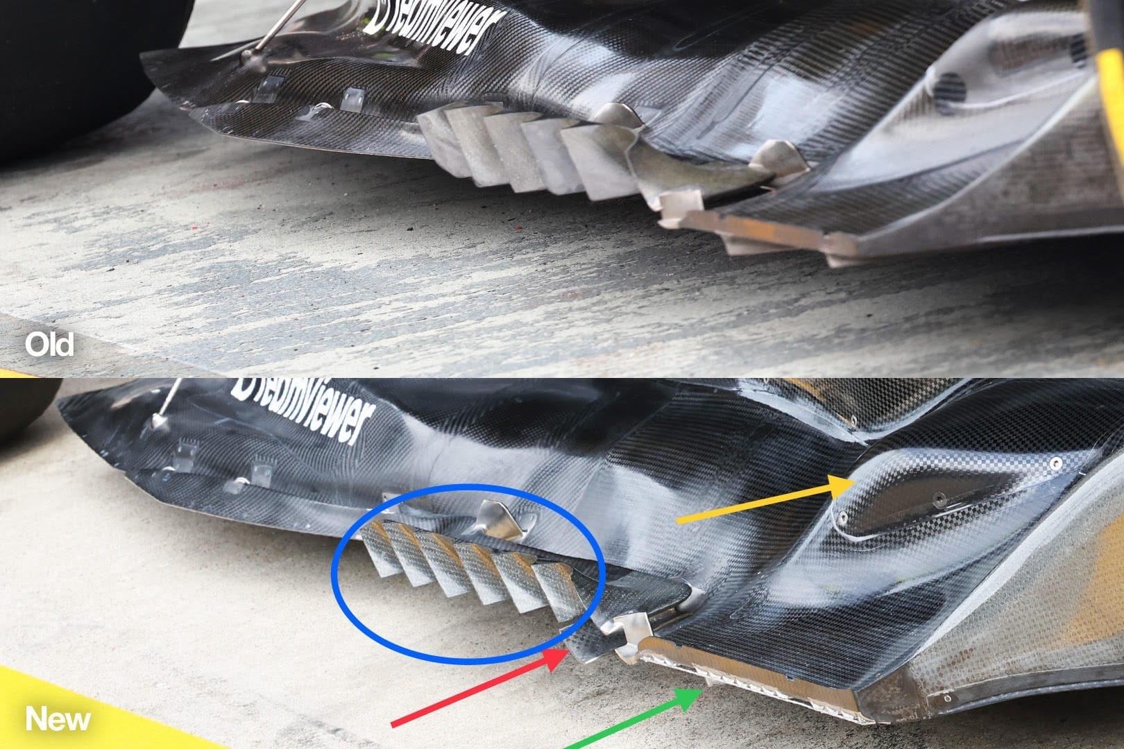 The increased sidepod inlet undercut should mean more mass flow over the upper surface of the underfloor. To make more use of this flow, Mercedes has reduced the size of the outer edge vanes and increased the number of them from five to six which are highlighted with a blue ellipse, adding a new one forward of those which is highlighted with a red arrow.