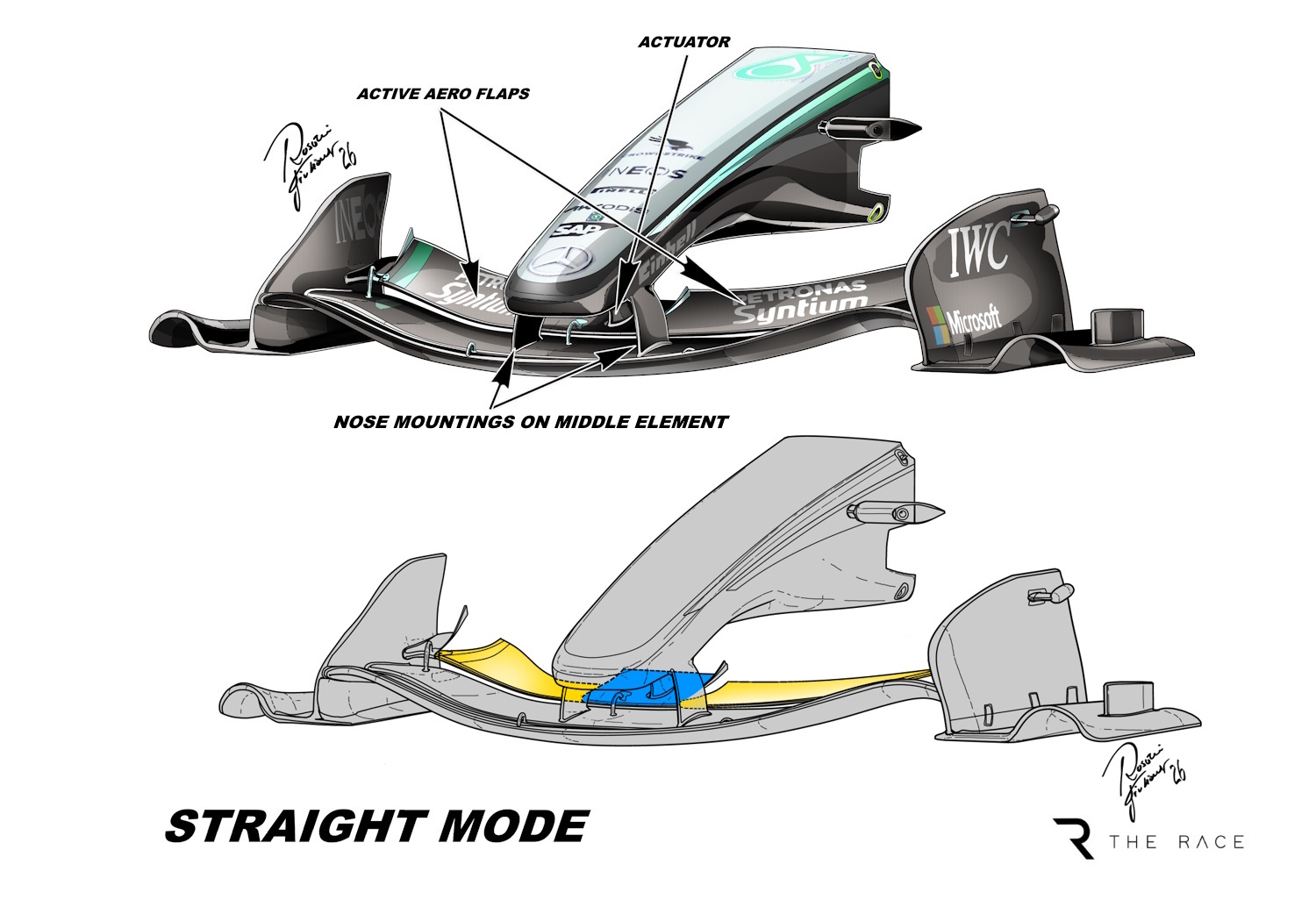 To enable this, the nose has to be mounted to the mainplane otherwise the middle element is locked in place. Mercedes and Aston Martin have decided to only move the upper-most part of the front wing (illustrated below).