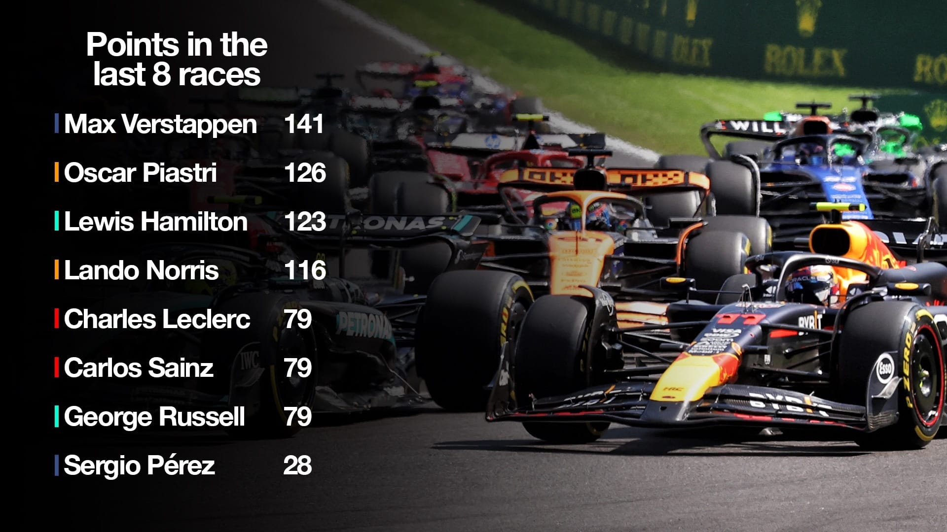 Plus, over the last eight races, Perez is miles behind the other drivers in the top four teams. So, yes, the scrutiny on him is unique - because he is uniquely underperforming.
