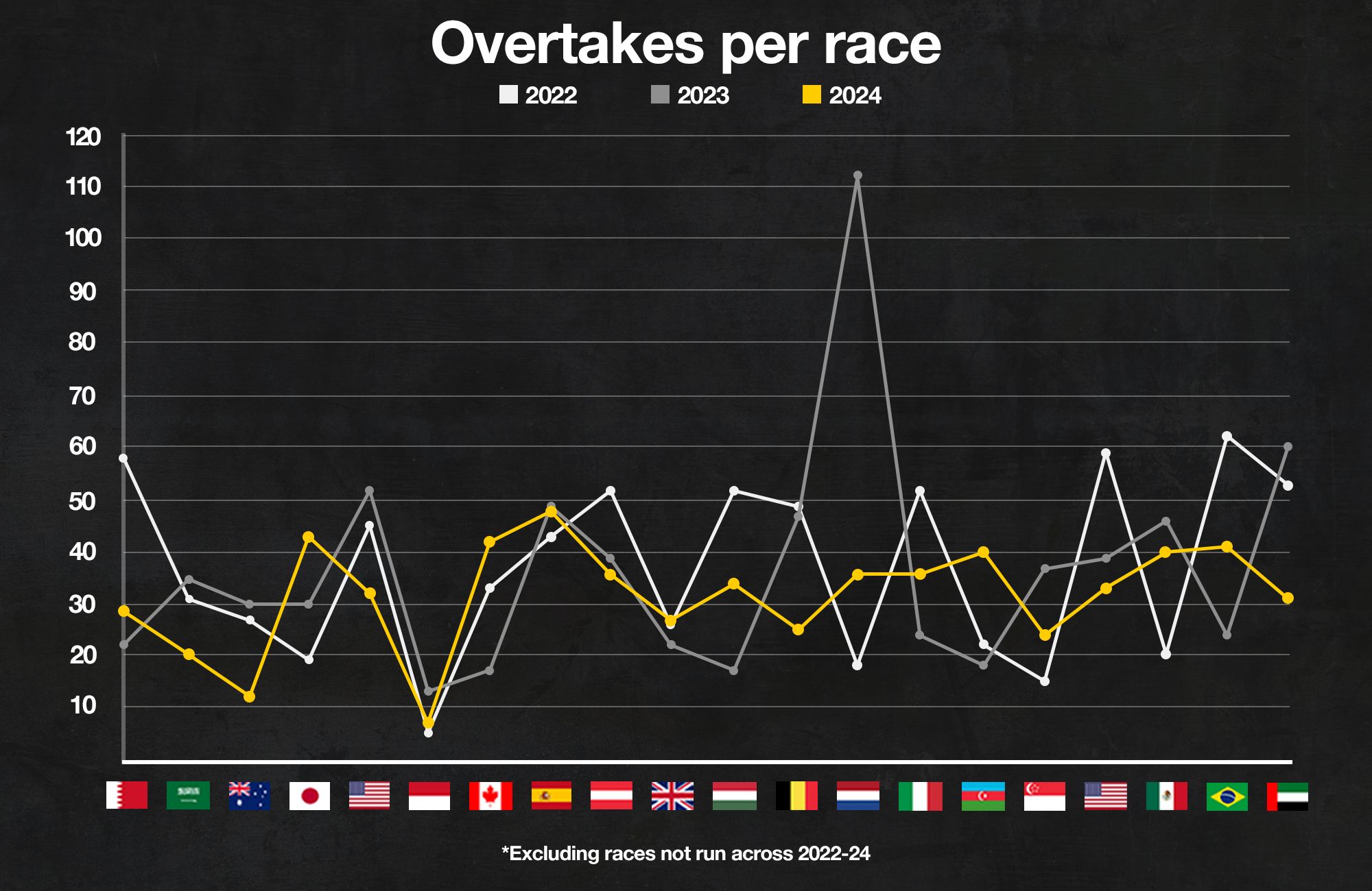 If we take the races that have been a part of the calendar for the past three seasons (so excluding China, Imola, Vegas and Qatar), then the stats show the number of passes from the 20 consistent events were: 741 in 2022, 733 in 2023 and down to only 636 in 2024.