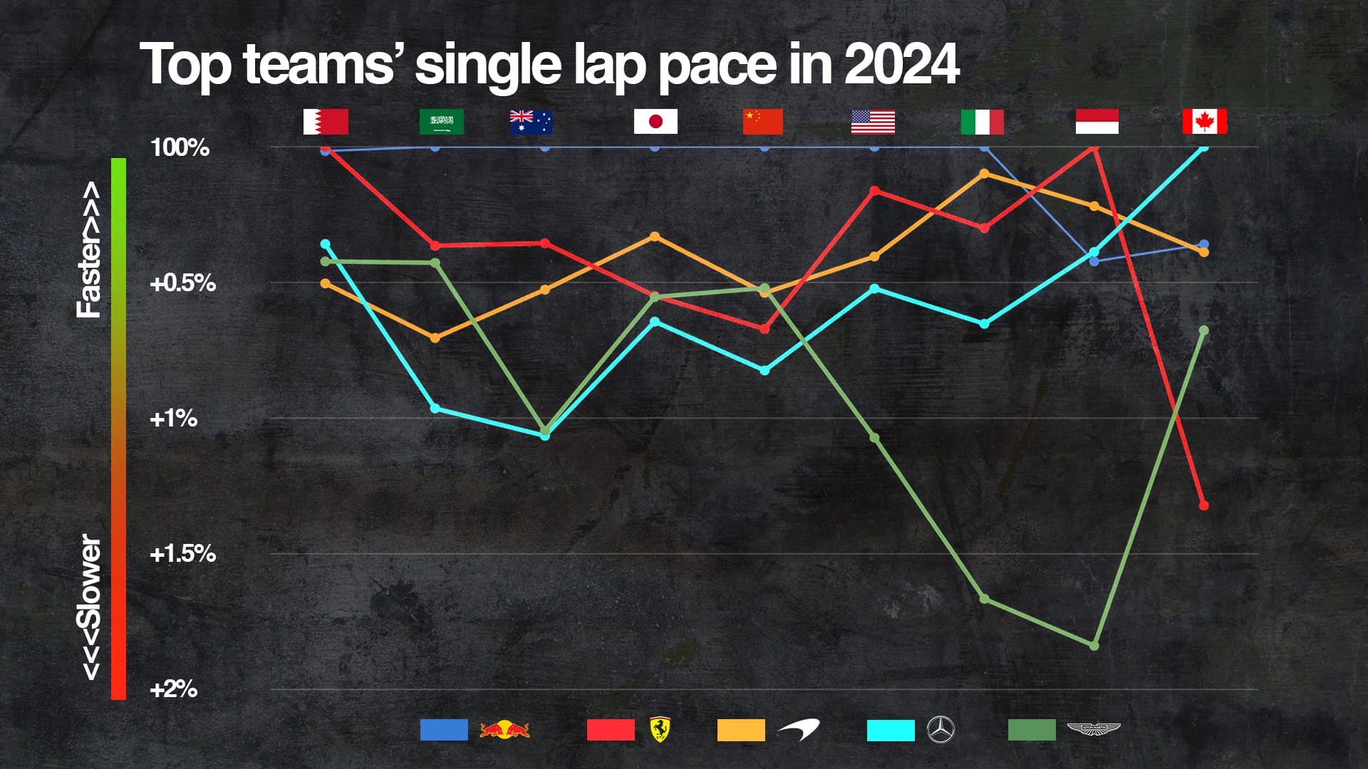 It’s a close enough rival to be targeting regular podiums and snipe for victories in the right circumstances. But on pure pace – using the fastest lap from a weekend expressed as a percentage of the absolute fastest – McLaren’s deficit has gone from 0.521% to 0.278%, or around four tenths to two tenths. Which is impressive, but still reflects a deficit.