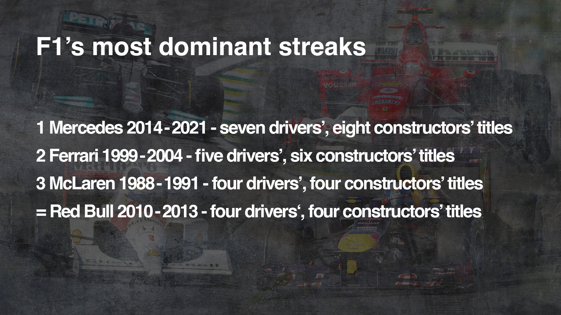 Then, Vettel led Red Bull to the first of four consecutive drivers’ and constructors’ championship doubles. The spell from 2010 to 2013 is among the most successful for any team in F1 history.