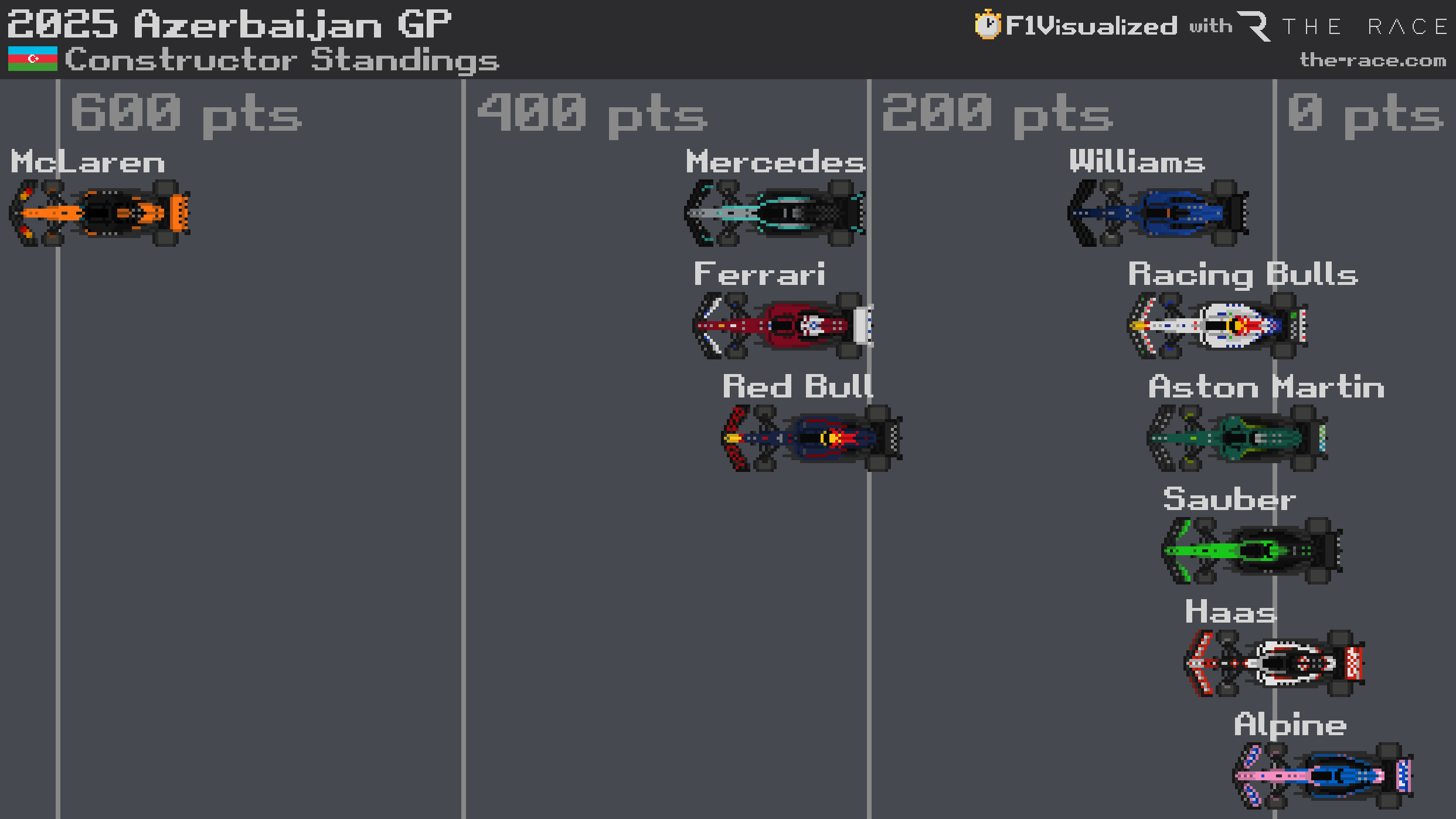 That result moved Williams into triple figures in the constructors' championship - it now has 101 points - and extended its buffer in the fight for fifth in the constructors' championship to 29 points, with Racing Bulls now its nearest rival.