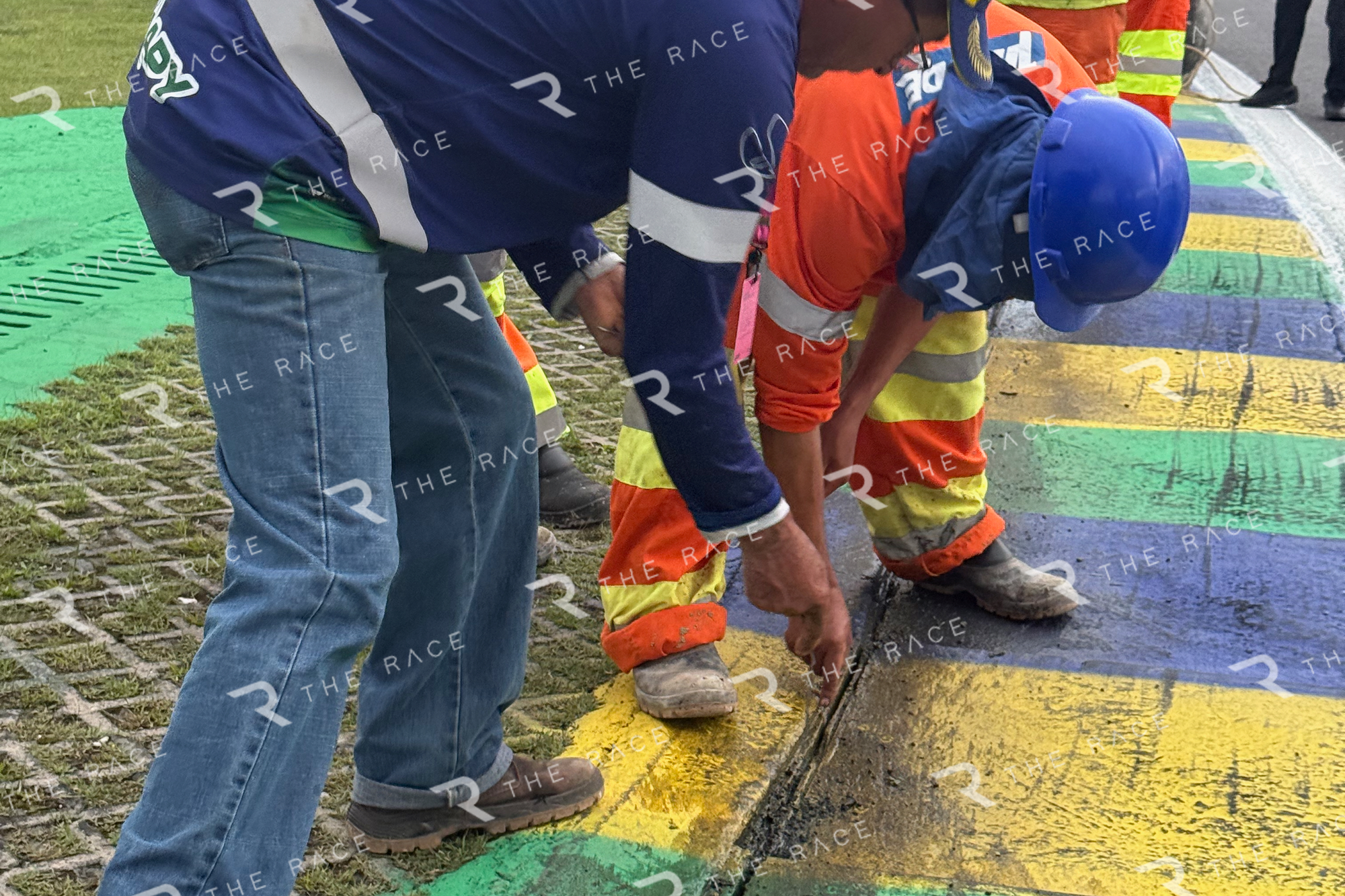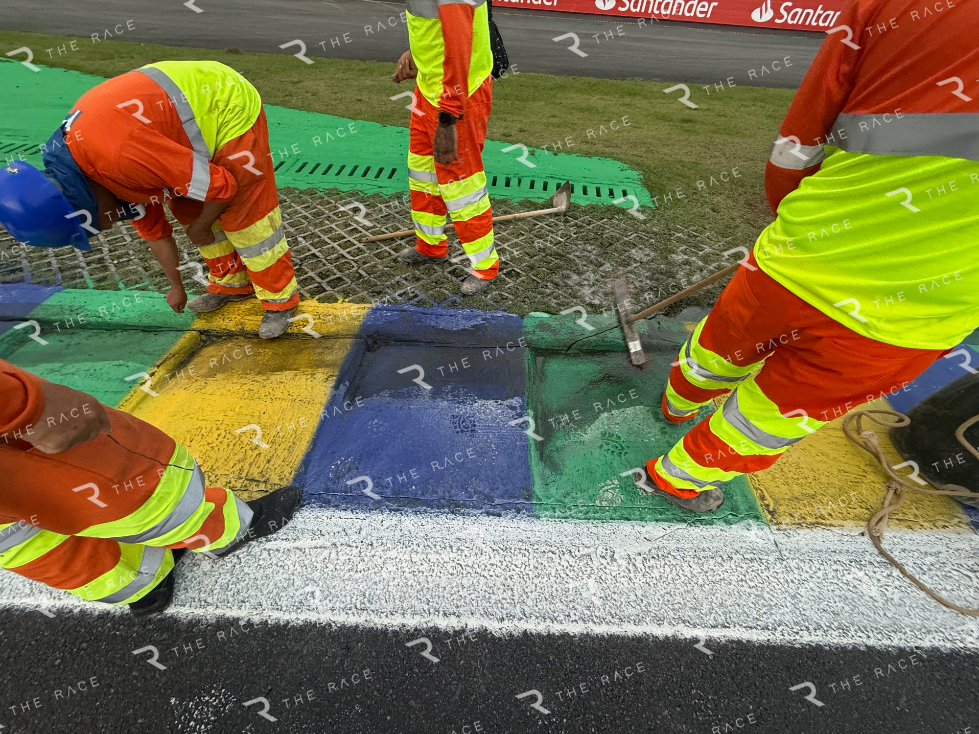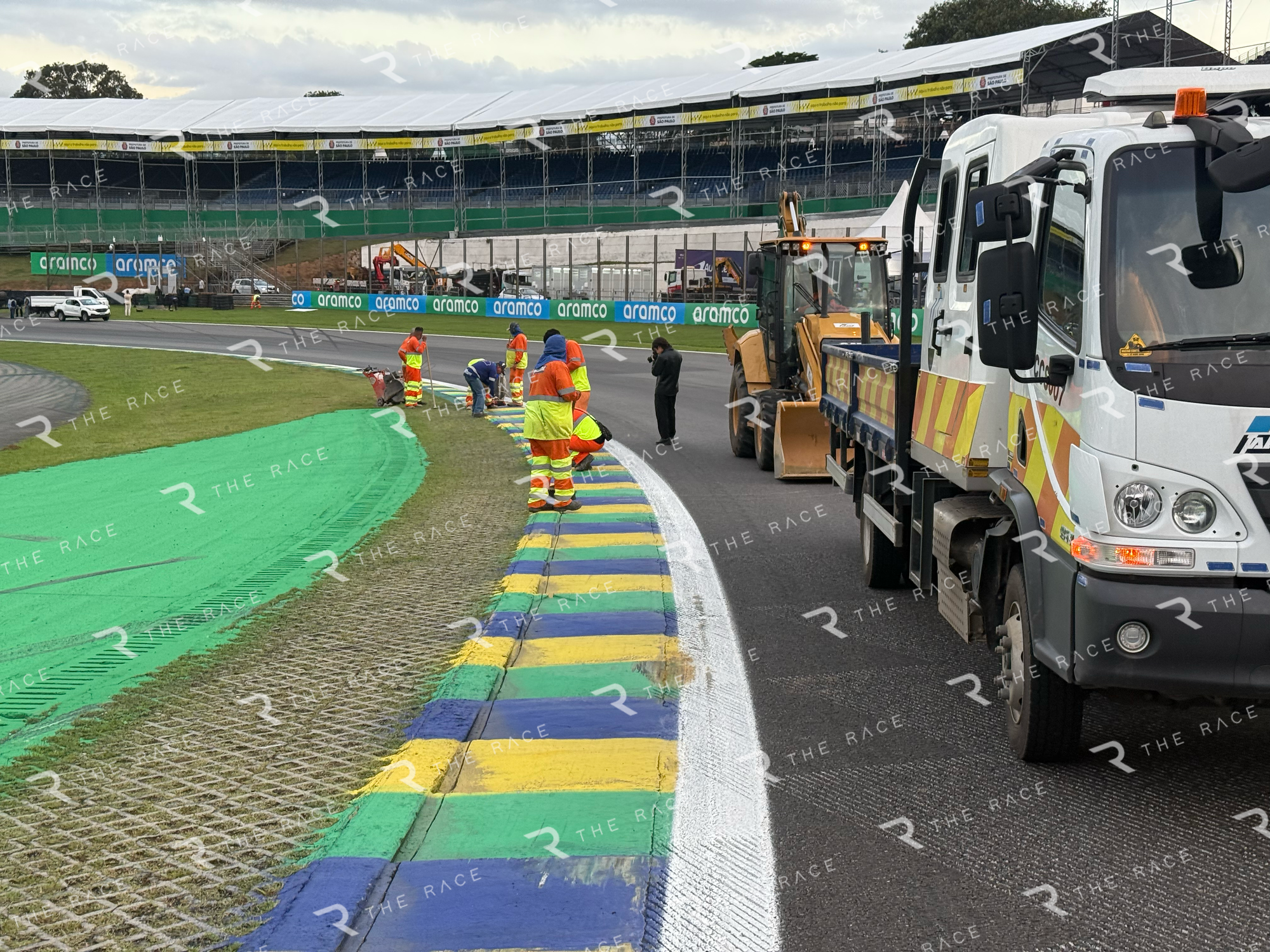 The official forecast for the Brazilian Grand Prix race day is to be dry, but it is clear that the organisers do not want to take any risks with the Turn 3 kerbs in case the rain does return.