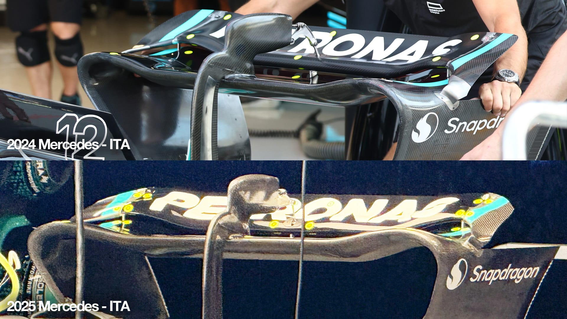 Mercedes has so far appeared with a rear wing that appears to be a development of what it ran 12 months ago.