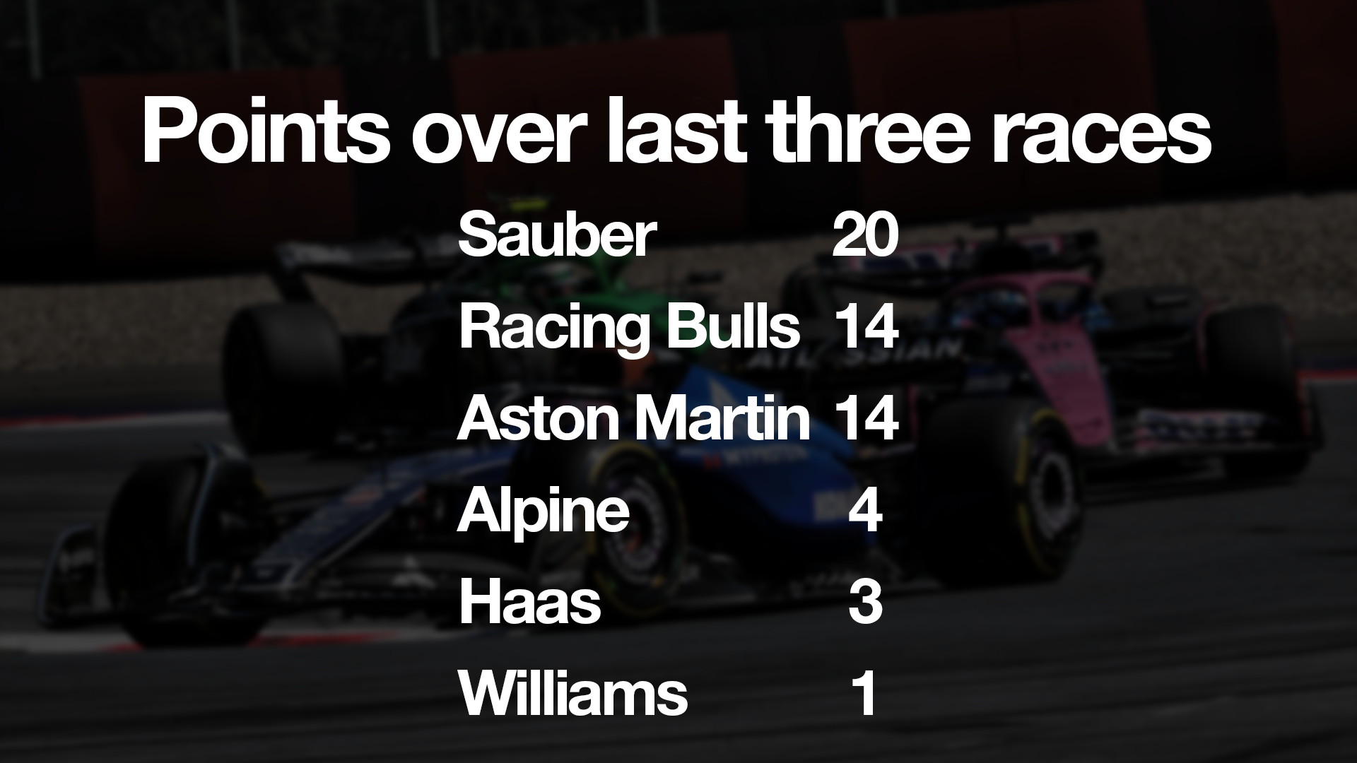Williams has only scored one point in the last three races, fewer than any other team.