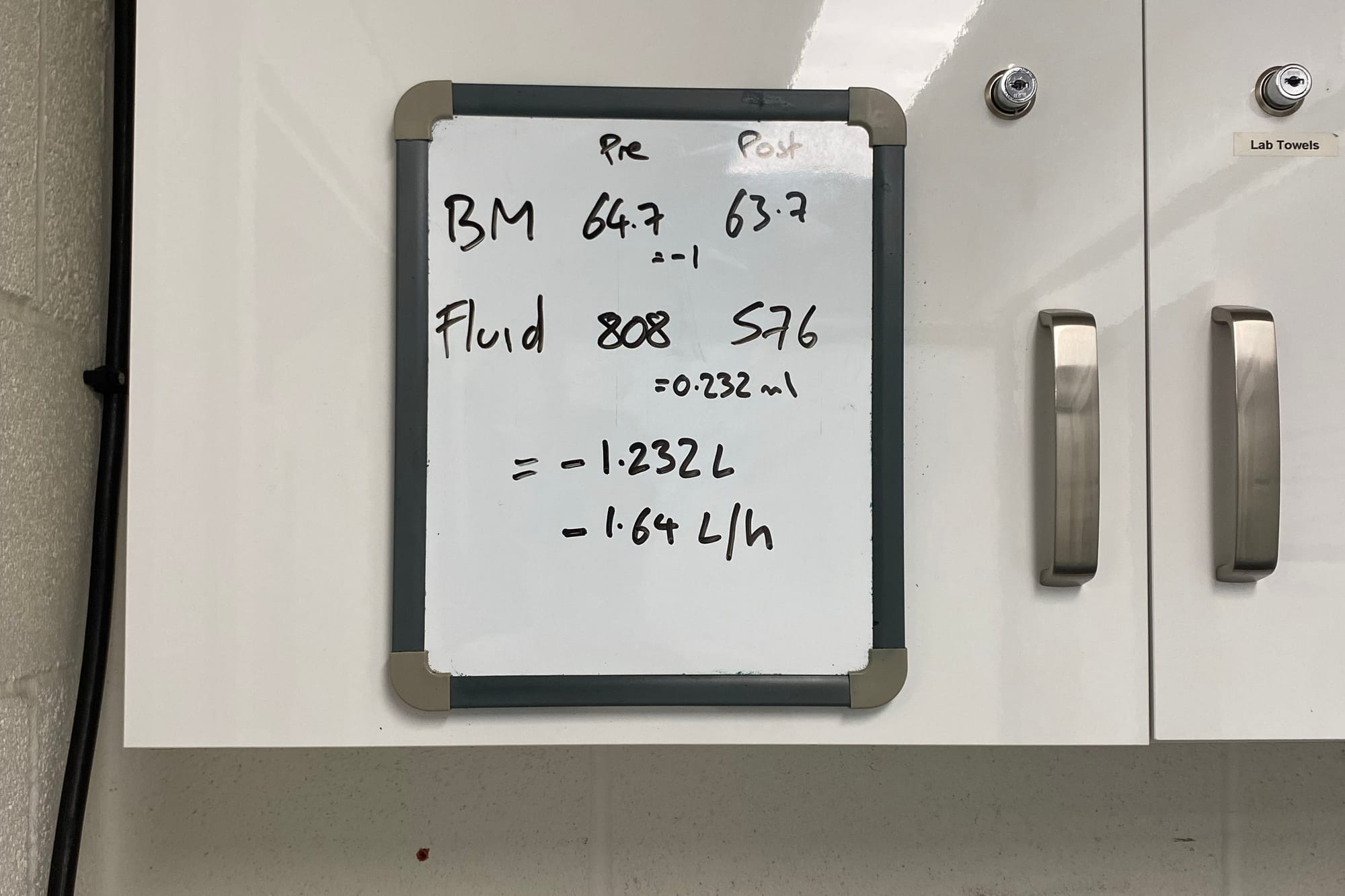 For the full experience, we've agreed to a few extra measurements. Starting (and ending) mass is taken and, in addition to the heart rate monitor and four skin thermistors that will measure my skin temperature, I also insert a rectal thermistor so the change in my core body temperature can be charted throughout.