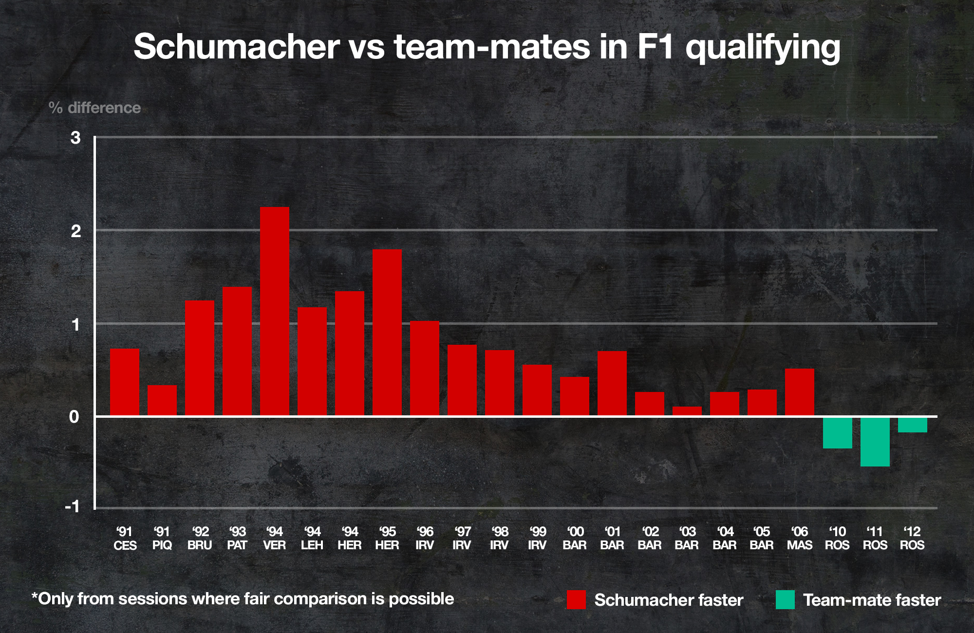 A big part of his advantage during Schumacher’s great years had been his amazing facility to lap flat-out for an entire stint.