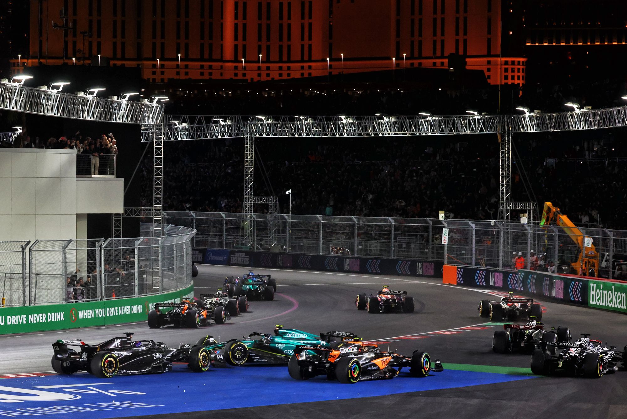 Instead he was taken wide by a spinning Alonso at Turn 1, confronted with a face full of that Aston Martin pointed the wrong way and rear-ended by Perez too as he helplessly bumped into it.