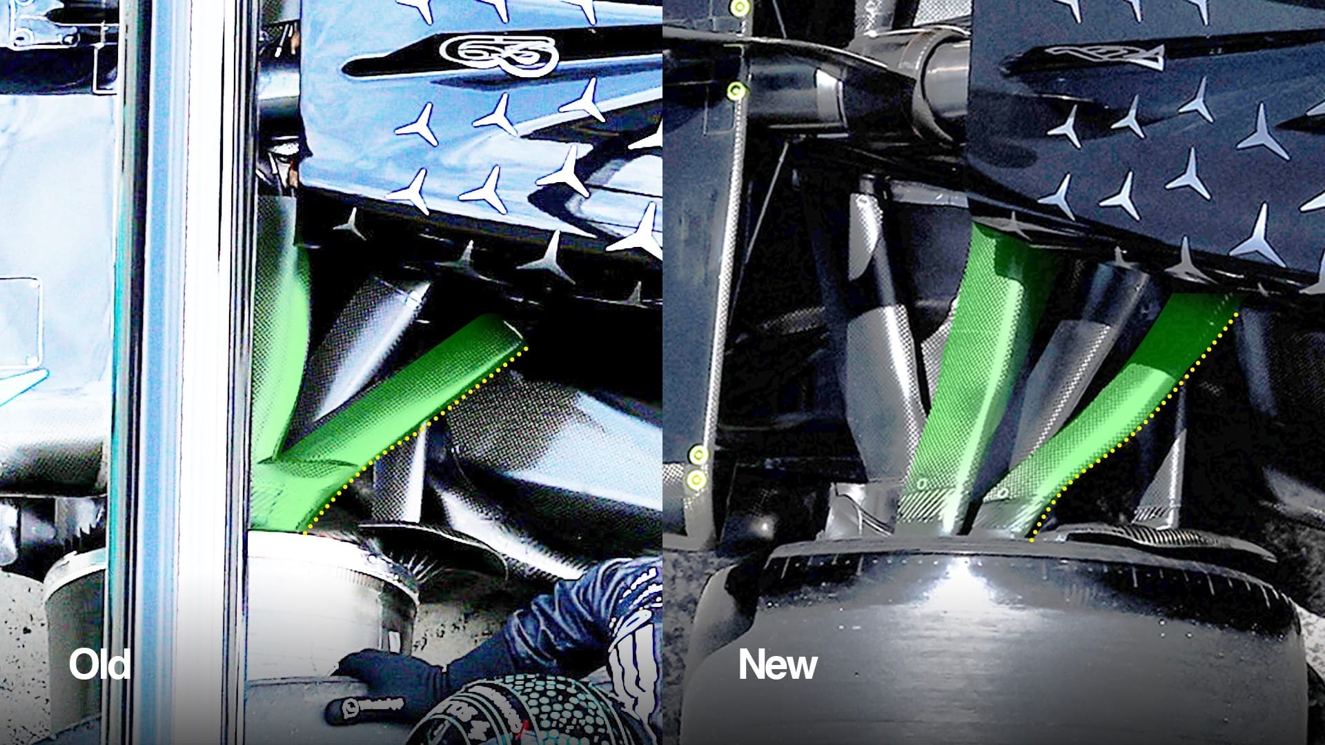 Imola marked the debut of Mercedes' first big upgrade of 2025 - front suspension leg fairings with a notable McLaren-like upward flick, a new front wing and a reprofiled rear engine cover.