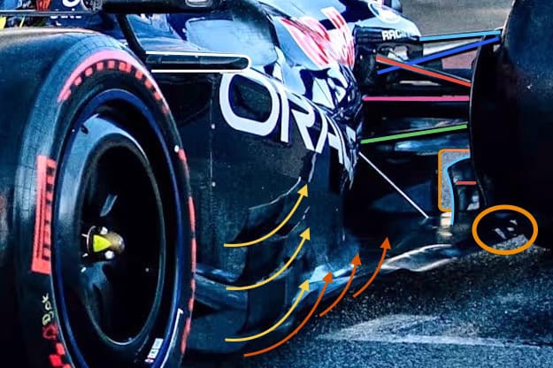 It may be that Red Bull doesn't have a side in the diffuser in that area going rearwards and so is then using the turning vane further outboard (light blue highlight line) to help pull airflow through the diffuser by connecting what we call the 'tyre squirt' airflow that is created by the tyre rotating onto the track surface.