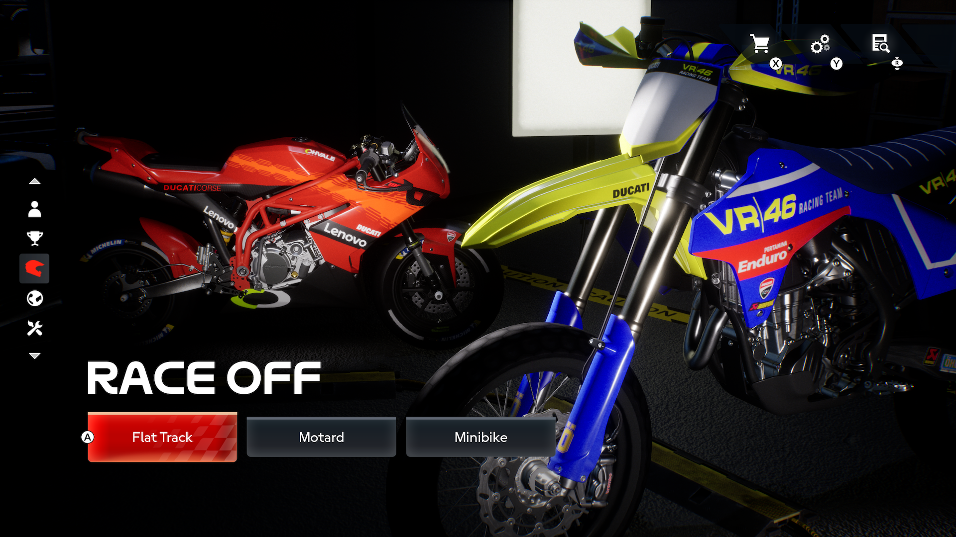 A new feature this year is the 'Race off' mode, where you can take part in 'training' races on different bikes, just like many of the real world riders do. You can race off-road Flat Tracks, agile Minibikes or Motards.