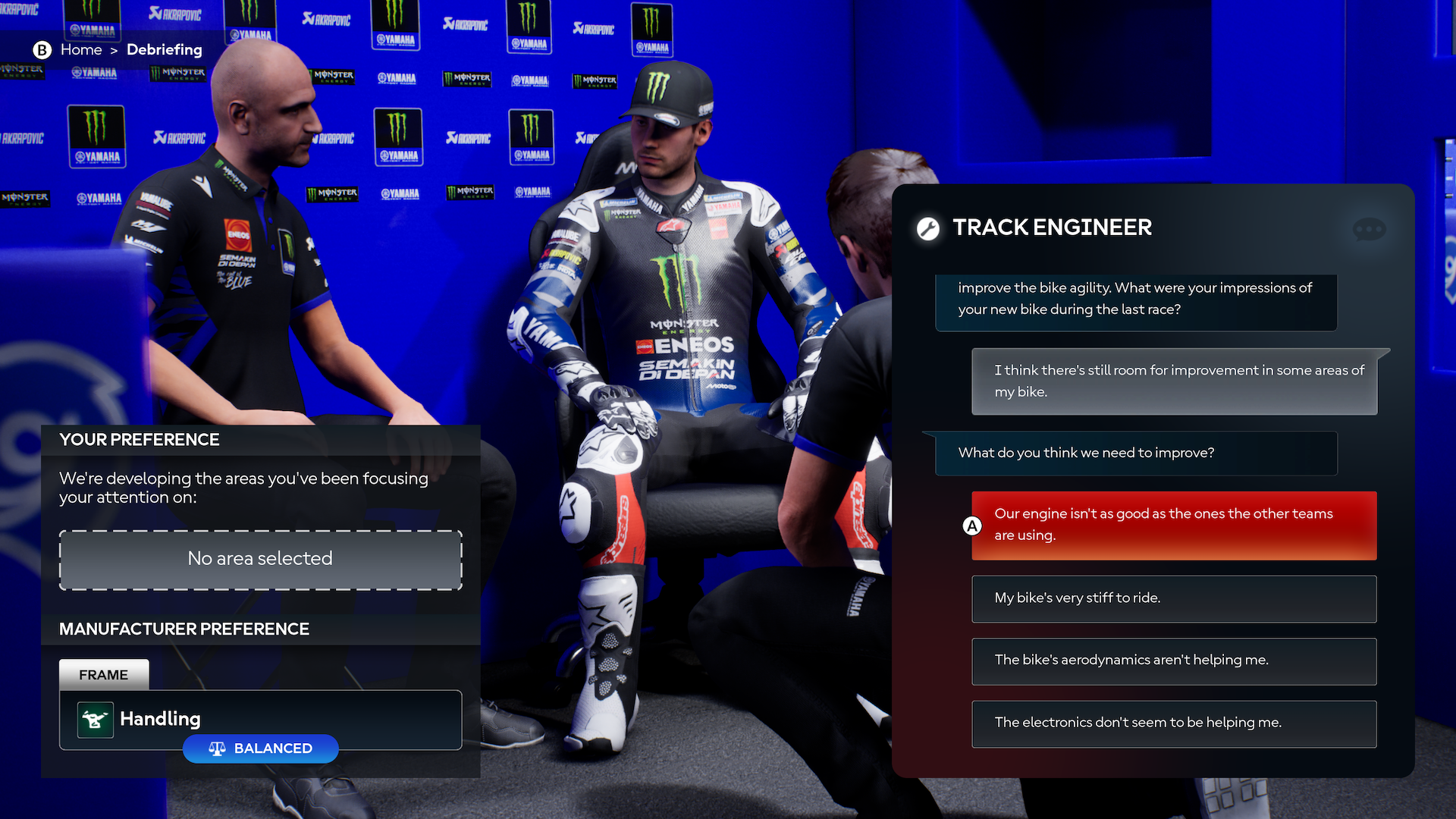 On the bike development front, a new feature is the chance to debrief with your engineer after each weekend. You can feed back on which parts of the bike you think are weak, or choose to let the team steer the development path. You might also be told what your team-mate wants to improve, or (and this is a nice touch) if you are riding a satellite bike you can be told what the lead works rider is trying to develop.