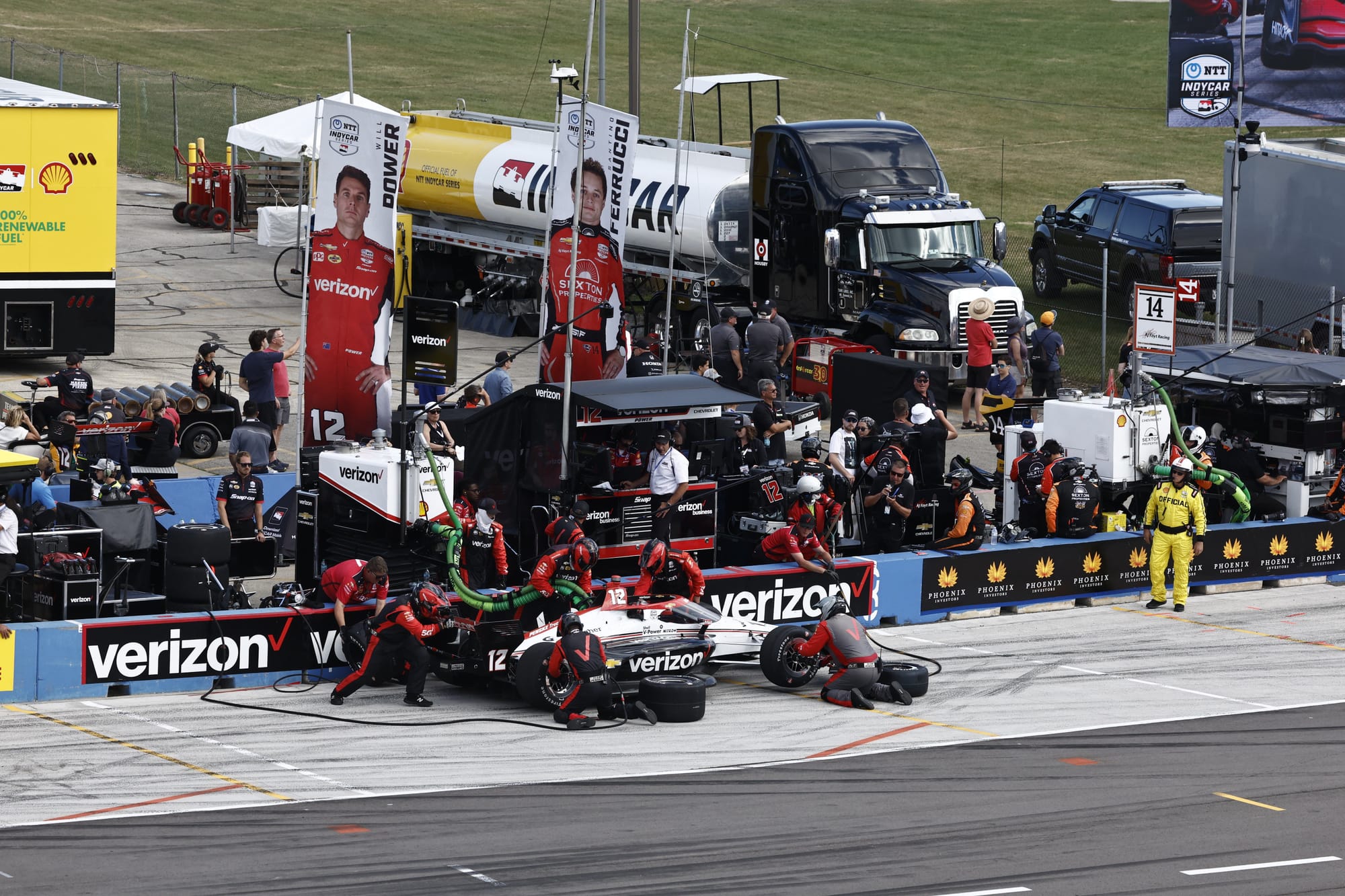While all of this was happening Palou pulled onto the track but stopped between Turns 2 & 3, and was carried back to the paddock for further repairs by a truck with a crane on the back. He came sprinting from the paddock to his timing stand, where after frantic discussions he did at least crack a laugh with strategist Barry Wanser.