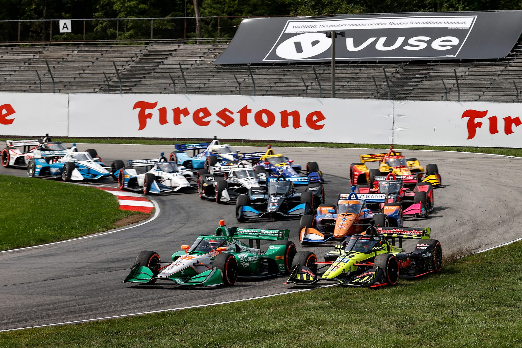 Palou had an average start of 12.29 and finish of 14.71, with the standout mishaps coming in the second Mid-Ohio race - where he qualified fourth but got shunted off at the first corner by Ferrucci (pictured going wide) - and then at Indianapolis.