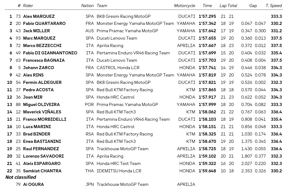 Advancing to Q2: A Marquez, Quartararo, Miller, M Marquez, Bezzecchi, Di Giannantonio, Bagnaia, Zarco, Rins, Aldeguer
