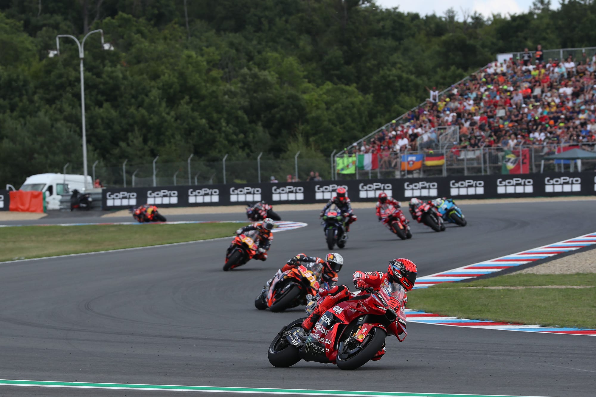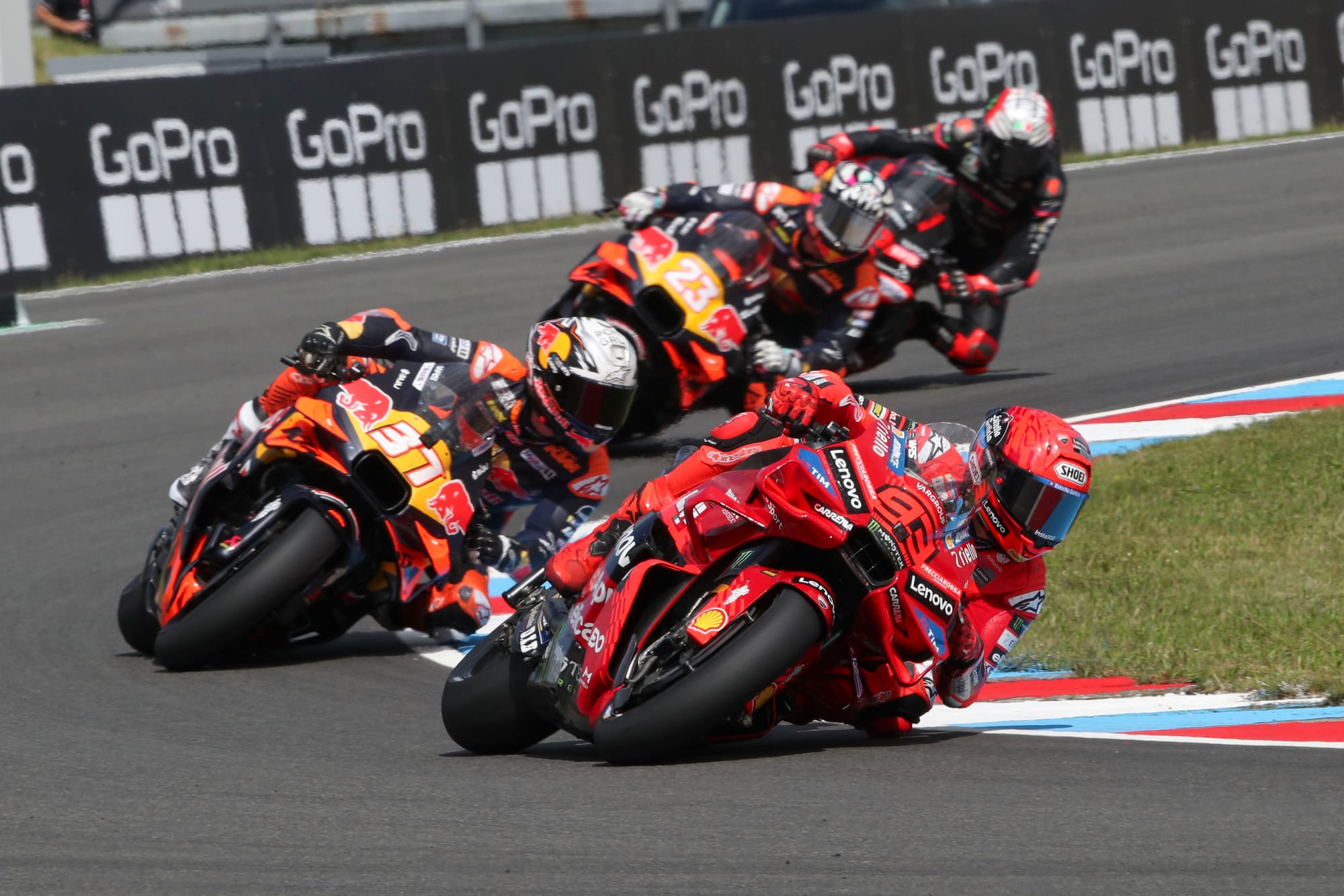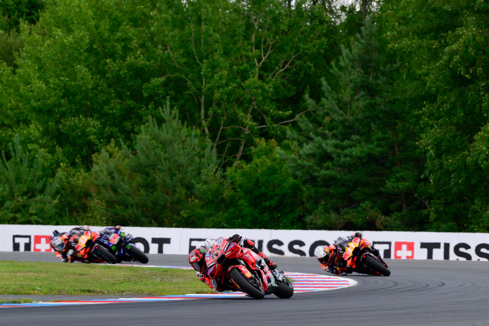 Marquez and Bagnaia ran a comfortable 1-2 out front in the early going, but both deliberately dropped back to let other riders past in order to artificially spike their front tyre pressures in the slipstream.