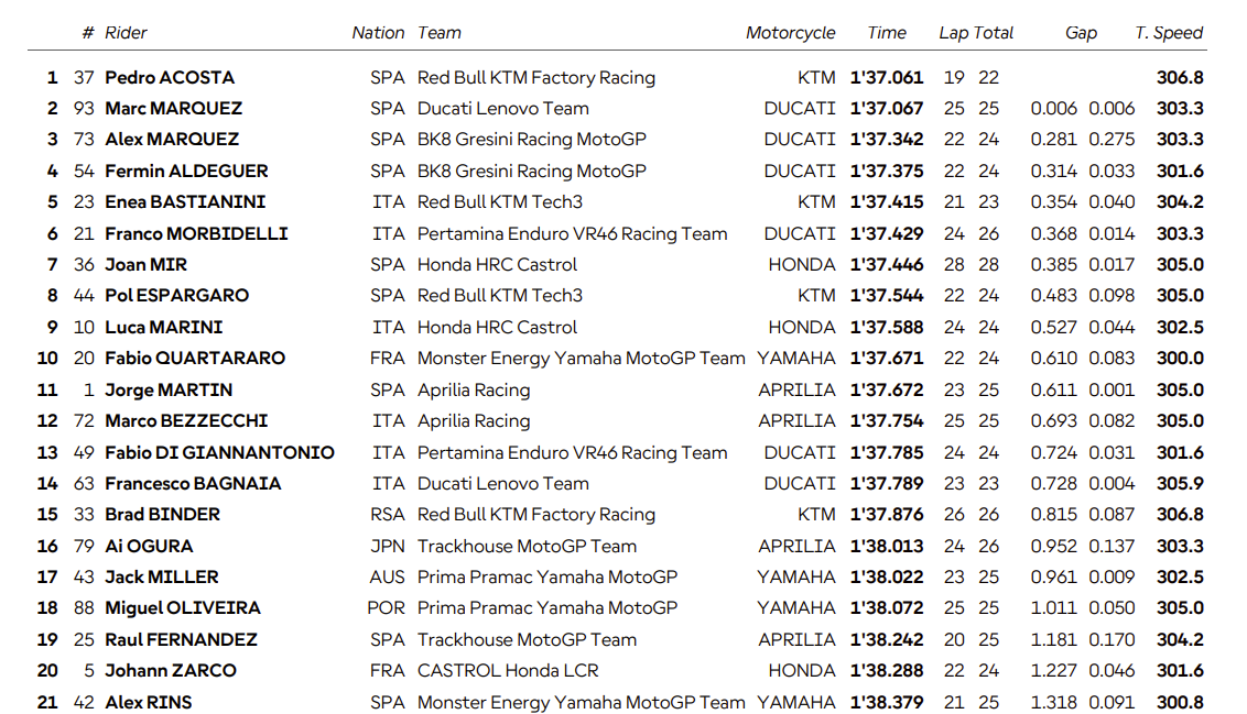Gresini team-mate Aldeguer was fourth, with Enea Bastianini, Franco Morbidelli, Joan Mir and KTM tester Pol Espargaro completing the top eight.