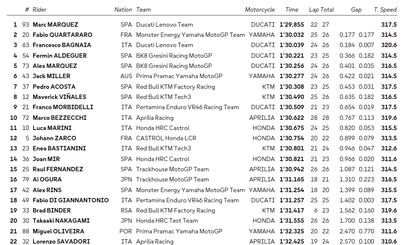 Gresini rookie Fermin Aldeguer was a superb fourth, 0.37s off Marquez but 0.04s ahead of the other Marquez, his points-leading Gresini team-mate Alex.