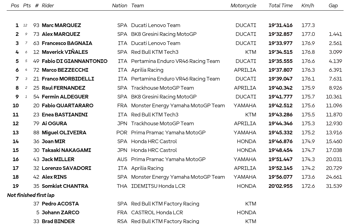The Marquezes took the flag 1.4s apart, maintaining their remarkable streak of finishing 1-2 in some order in every single sprint so far this year. They are now 35 points apart in the standings.