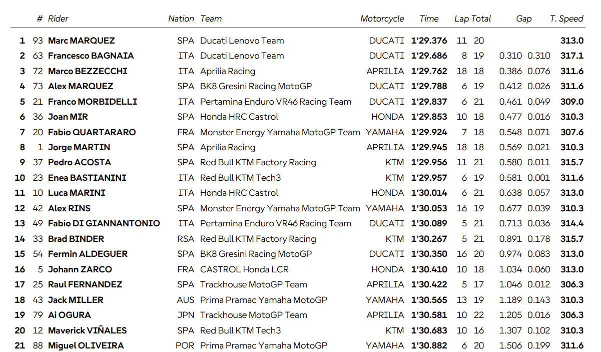 Team-mate Pecco Bagnaia was at the sharp end early on instead, but finished the session three tenths back from Marquez's time, followed by Aprilia's Marco Bezzecchi - the only non-Ducati rider in the top five - and Ducati satellite riders Alex Marquez and Franco Morbidelli, the latter making his return from injury.