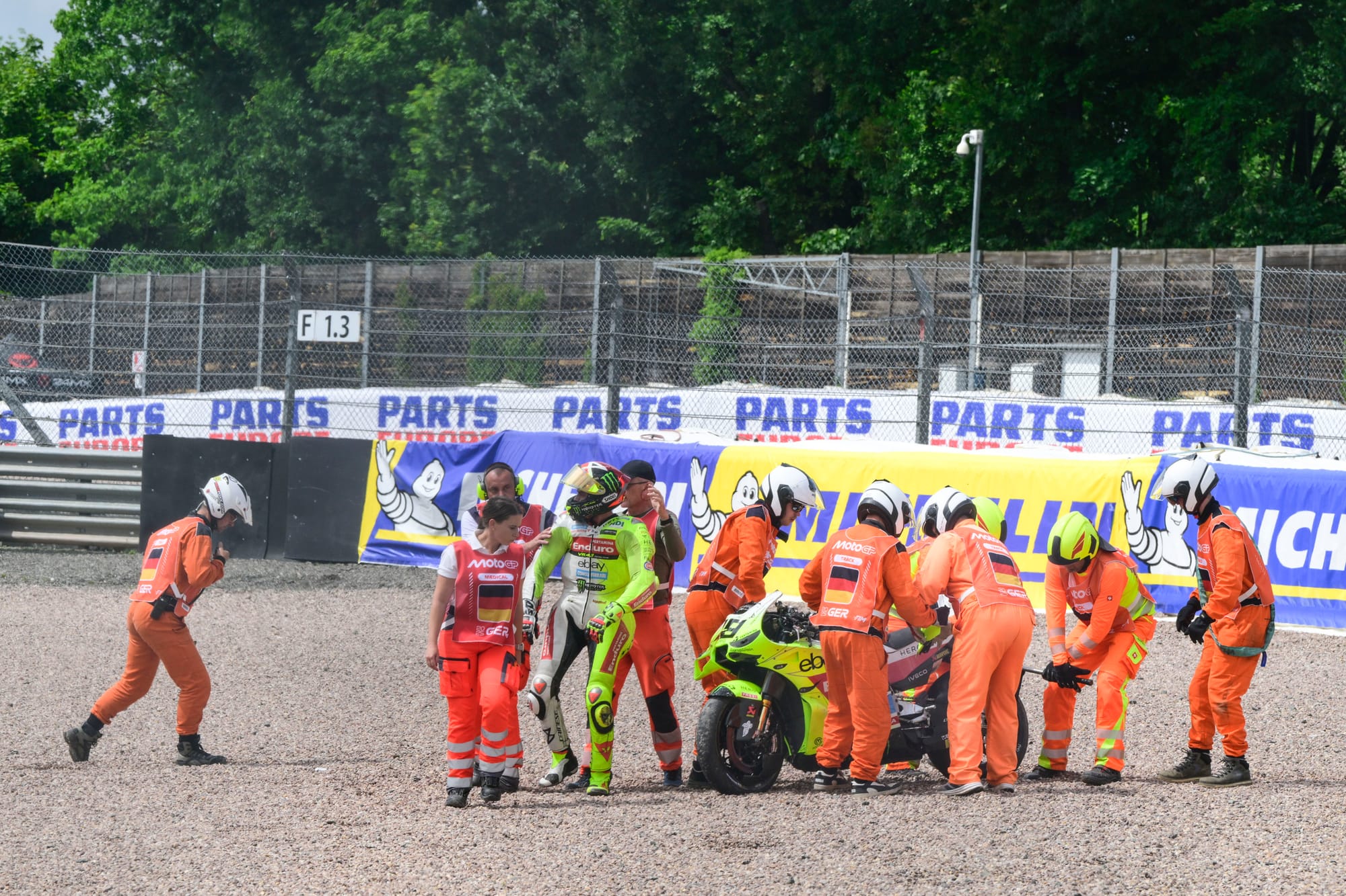 Aprilia tester Lorenzo Savadori, who had crashed earlier in the race and was running two laps down, also crashed arriving at the scene.