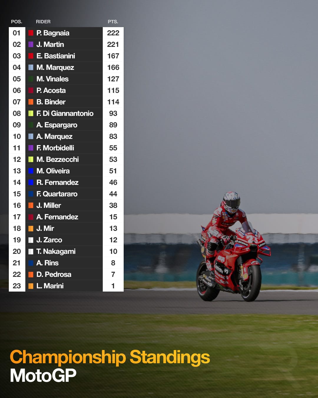 Making a bad start from his strong starting position on the front row and failing to properly capitalise on title rival Martin’s slightly more difficult second row launch, Bagnaia found himself in fourth behind not just Martin, but also his team-mate Enea Bastianini and the Aprilia of Aleix Espargaro after a chaotic few opening corners.