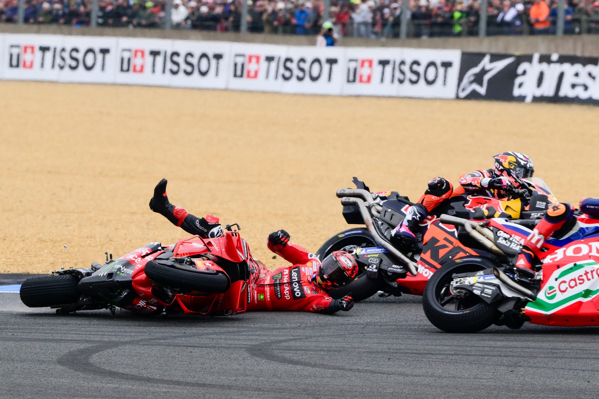 But the chaos of the different tyre compounds on the (at that point) dry run to the Dunlop chicane left Bagnaia in the firing line.