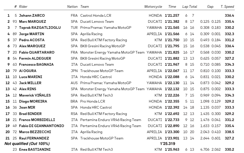 Advancing to Q2: Zarco, M Marquez, Razgatlioglu, Martin, Acosta, A Marquez, Quartararo, Aldeguer, Bagnaia, Ogura