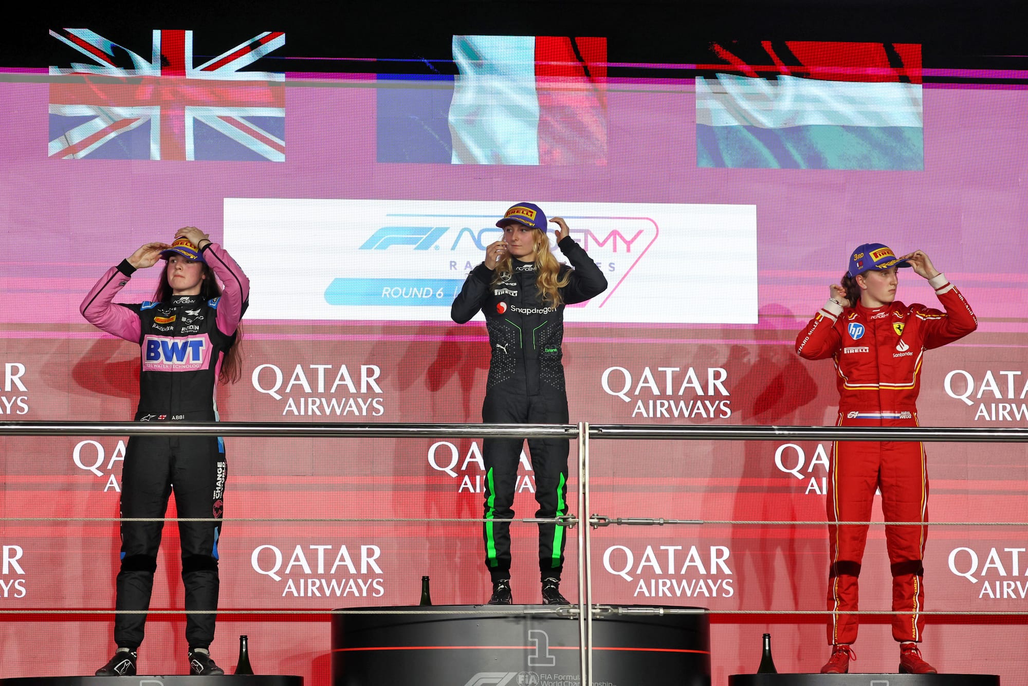 Pulling celebrated her title victory in parc ferme in Qatar with her Rodin team and the Alpine F1 academy that backs her.